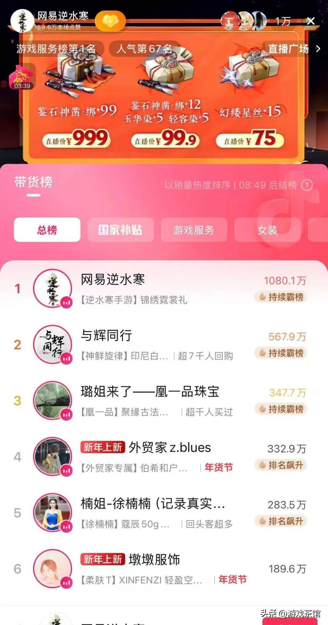 一方面,在春节版本上线当天,大量玩家在社交平台分享了充值奇遇(三方平台支付优惠),之后的抖音直播“大宋年货节”,甚至超过董宇辉,登上总榜第一。